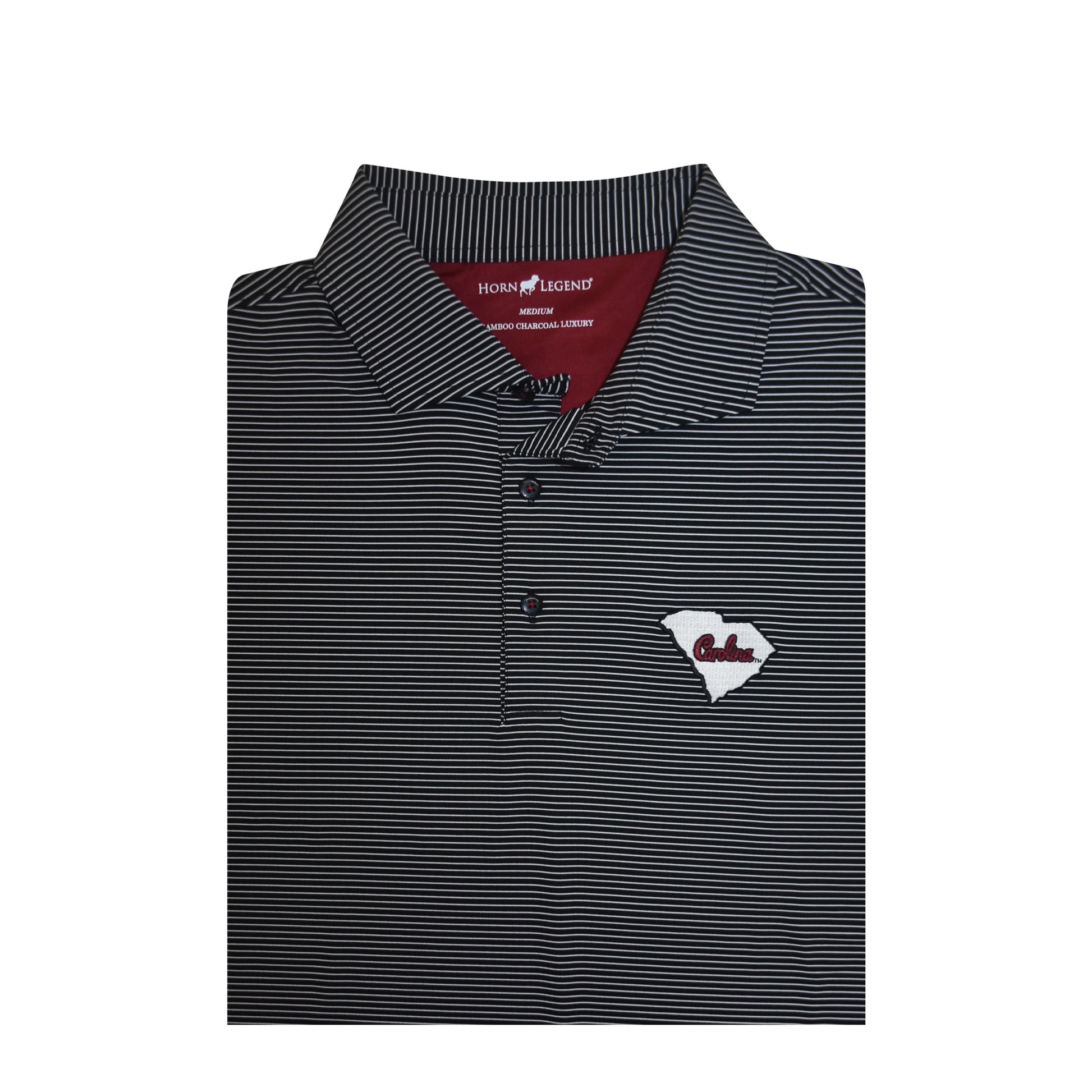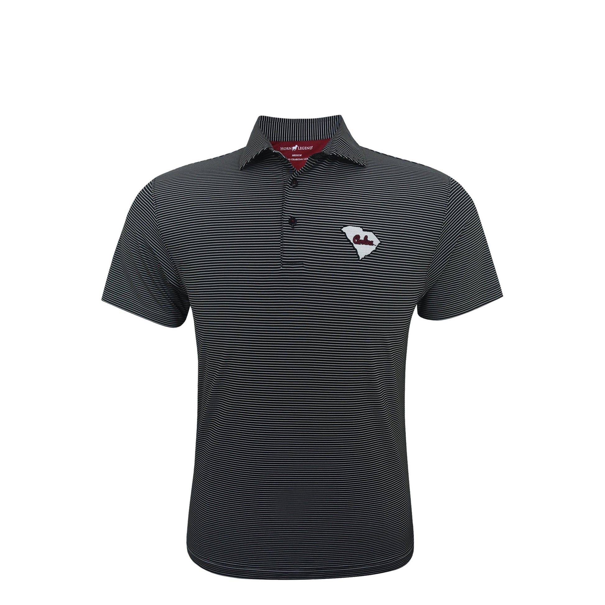 Black and white mini stripe polo with the new Carolina script surrounded by the state logo!