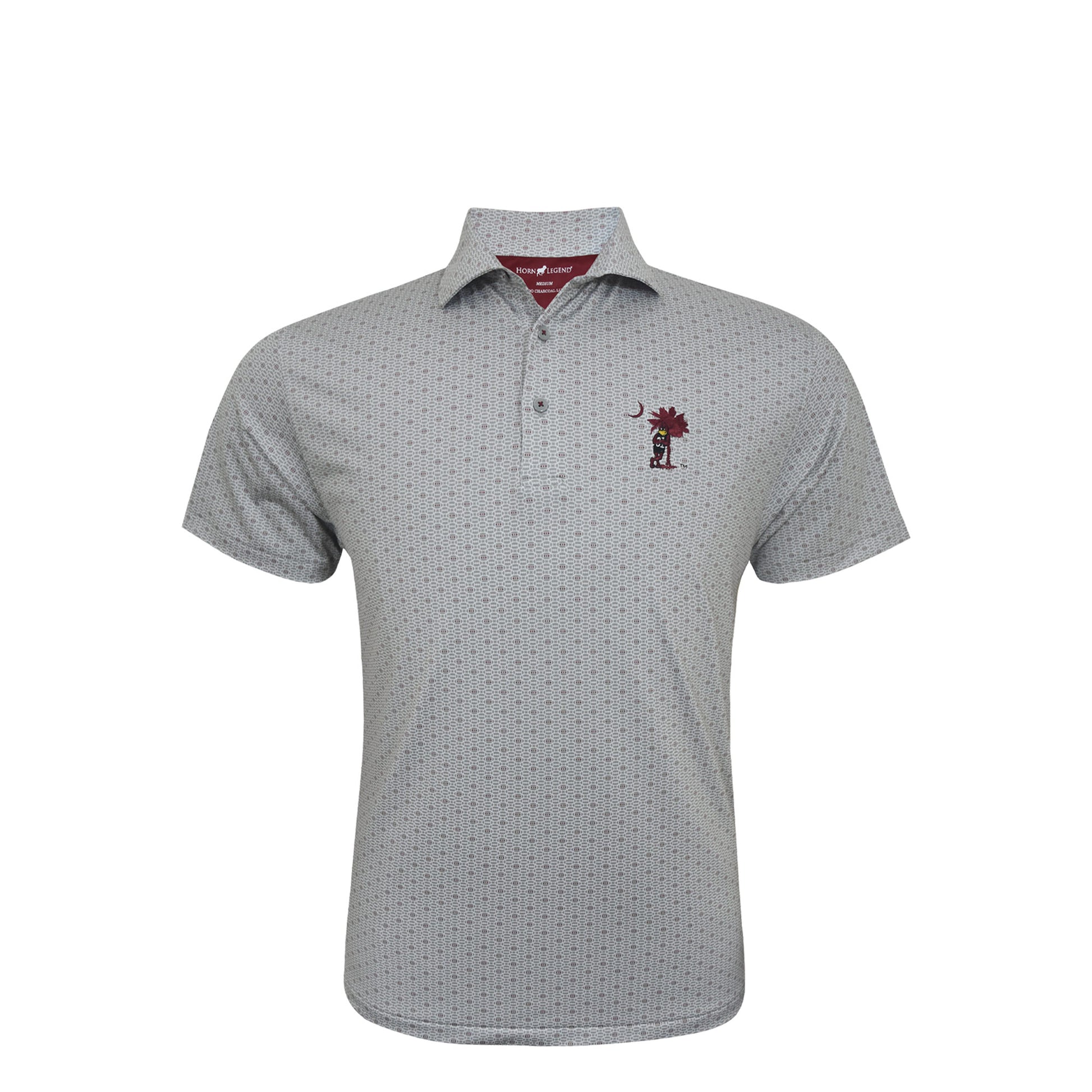 This polo features a grey and garnet football print with the cocky leaning on the tree logo!